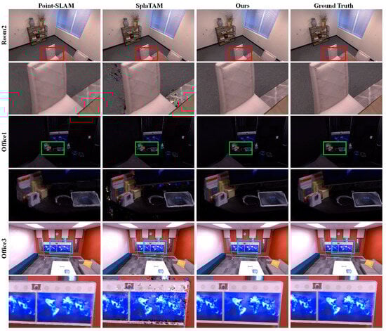 Visual simultaneous localization and mapping (SLAM) is a technology in which robots rely on their vision sensors to enable real-time positioning and mapping in unknown environments [,]. After decades of development, SLAM has been widely used in fields such as autonomous driving, virtual reality, and augmented reality (AR). Traditional SLAM methods have achieved precise tracking accuracy in a variety of environments while using point clouds [,,,], meshes [,], voxel [,,], or truncated signed distance function (TSDF) [,,] to represent the scene. However, to adapt to increasingly complex downstream tasks such as autonomous goal navigation and human-computer interaction, SLAM systems need to make breakthroughs in map quality and density so that the maps constructed by the system have real-world realism.