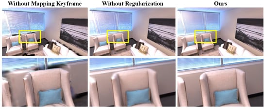 We perform ablation experiments with RD-SLAM on room0 sequences of the Replica dataset to evaluate the effectiveness of the dual keyframe selection strategy and scale regularization. As shown in Figure 7, we exclude the mapping keyframes and scale regularization to verify their effects on the system. Without mapping keyframes, the resulting rendered image produces voids at the edges due to the ineffective implementation of the densification strategy. With scale regularization removed, the scale of the 3D Gaussian is not effectively constrained, resulting in the system being unable to render the fine details of the scene.
