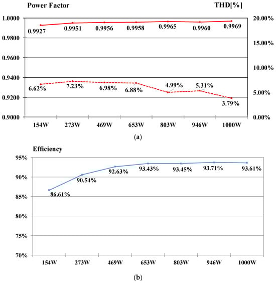 Figure 22 presents the total harmonic distortion (THDi), power factor (PF), and overall efficiency characteristics of the experimental results obtained by selecting the average link voltage (VLink: 565 VDC) from the results shown in Figure 17 while controlling only the primary-side link voltage (VLink: 565 VDC) without wireless communication. As shown in Figure 22a, the power factor (PF) and THDi characteristics indicate that, under load conditions of 154 W or higher, the power factor (PF) remains above 0.99, and the THDi is below 10%. Specifically, under the rated-load condition (1 kW), a low THDi of 3.79% is observed. Furthermore, based on the efficiency characteristics graph shown in Figure 22b, it was observed that, from a load condition of 273 W onwards, the system achieves an efficiency of 90.54% within the link voltage control range (VLink: 565 VDC). For higher load conditions, the system maintains an efficiency above 90%, reaching a maximum efficiency of 93.61% under the rated load (1 kW).