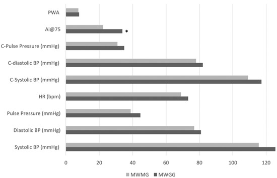 The comparison of physiological parameters between the MWGG and MWMG revealed no statistically significant differences in brachial and central, systolic, and diastolic BP levels, as well as in heart rate. There was no significant difference in the pulse wave analysis (PWA) between the two groups. However, the augmentation index (Ai@75) resulted as significantly higher in the MWGG compared to the MWMG (33.90 ± 2.63 vs. 22.42 ± 5.27, p = 0.04) (Figure 1).