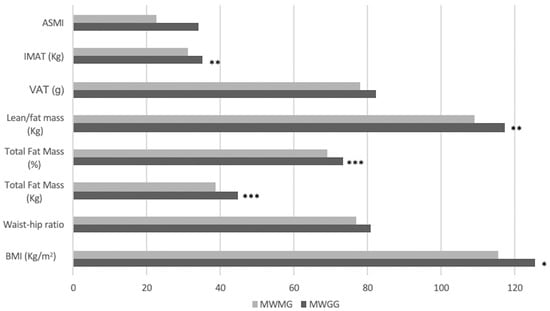 MWGG women presented with a higher BMI (29.00 ± 1.03 vs. 23.46 ± 1.16, p = 0.003), greater total fat mass (Kg) (28.19 ± 1.56 vs. 17.58 ± 2.02, p < 0.001), and higher percentage of total fat mass (38.71 ± 1.24 vs. 28.62 ± 2.48, p < 0.001) than MWMG ones. Additionally, patients in the MWGG showed a lower lean–to–fat mass ratio (1.53 ± 0.08 vs. 2.52 ± 0.29, p = 0.001) than those in the MWMG. However, there were no significant differences in waist–hip ratio, visceral adipose tissue (VAT), or appendicular skeletal muscle mass index (ASMI) between the two groups (p > 0.05).