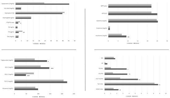 MWGG women showed significantly higher levels of insulinemia, LDL-C, triglycerides, FT3, FT3/FT4 ratio, Homeostatic Model Assessment for Insulin Resistance (HOMA index), TyG index, Chol Tot/HDL ratio, LDL/HDL ratio, and TG/HDL ratio (9.21 ± 0.38 vs. 6.86 ± 0.79, p < 0.007; 146.41 ± 7.43 vs. 109.74 ± 10.38, p = 0.001; 137.08 ± 16.31 vs. 85.14 ± 13.73, p = 0.04; 2.29 ± 0.37 vs. 3.70 ± 0.25, p = 0.02; 2,28 ± 0,17 vs. 1.45 ± 0.14, p = 0.005; 8.73 ± 0.11 vs. 8.14 ± 0.15, p = 0.007; 5.46 ± 0.74 vs. 2.54 ± 0.17, p = 0.009; 3.71 ± 0.58 vs. 1.36 ± 0.14, p = 0.008; 3.60 ± 0.71 vs. 1.04 ± 1.75, p = 0.01, respectively) and lower levels of HDL-C than MWMG patients (48.15 ± 5.26 vs. 81.85 ± 3.81, p < 0.001) (Figure 3).