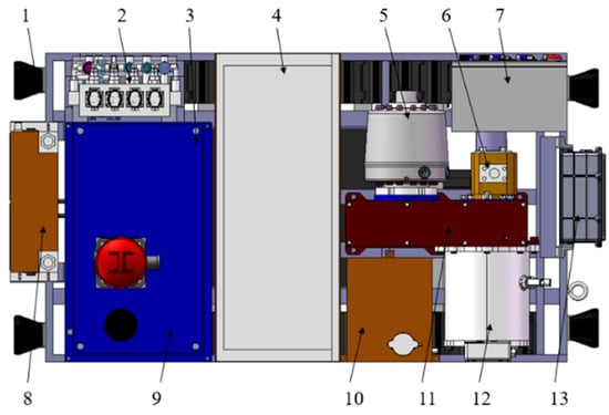 Layout of each component on the chassis of the tracked vehicle: 1. Lighting; 2. valve block; 3. battery; 4. carriage; 5. high-pressure pump; 6. low-pressure pump; 7. electric control box; 8. cooler; 9. liquid tank; 10. water tank; 11. reducer box; 12. motor; 13. motor controller.