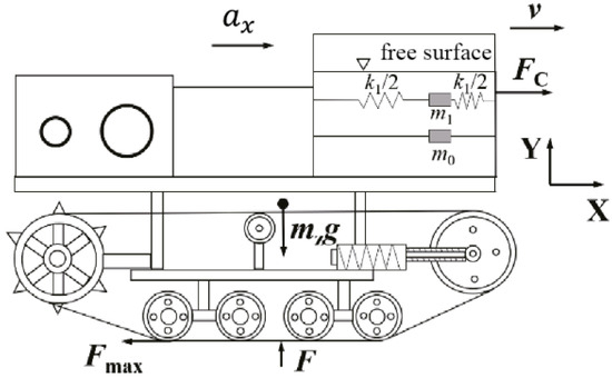Since the liquid impact in the tank affects the LBS of the tracked vehicle, it is necessary to study the kinematic and dynamic characteristics of the liquid in the tank when the tracked vehicle is driving on any road surface. The equivalent spring-mass mechanical model should be used to simulate the oscillations of the liquid in the tank []. Such liquid motion includes the oscillation term and the longitudinal impact force term, and can be expressed as follows: