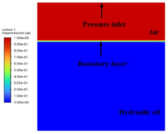 It is noteworthy that the main objective of this study was to solve the multiphase flow model problem; therefore, relevant parameters of the multiphase flow model were required to be set. The volume of fluid (VOF) model was used, with the number of phases set to two; the first phase was set as air while the second was hydraulic oil. The specific density of air was 1.225 kg⋅m−3, with its viscosity being 1.7894 × 10−5 kg⋅(m⋅s)−1. The density and viscosity of hydraulic oil were 876 kg⋅m−3 and 0.048 kg⋅(m⋅s)−1, respectively.