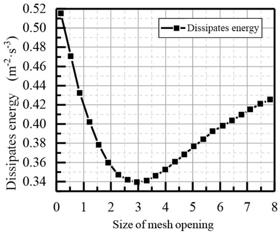 Notably, liquid oscillation is a turbulence problem; therefore, turbulent dissipation energy was used as an evaluation index for grid accuracy design []. Lower turbulent dissipation energy corresponded to a higher mesh accuracy. By using the turbulent dissipation energy function and ANSYS mesh size design, the mesh was designed accurately. The corresponding relationship between turbulent dissipated energy and mesh size is given in Figure 5.