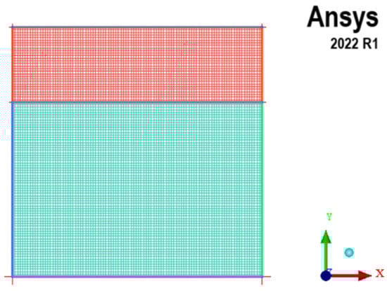 The CAE pre-processing software ICEM CFD 2023 R1was used to establish the liquid tank model. The longitudinal section of the tank was 0.34 m long and 0.34 m high. The liquid tank model and boundary conditions were set as shown in Figure 4. The free liquid surface of the liquid tank at the initial moment was the boundary line of the two-phase flow. Furthermore, the boundary of the 2D liquid slop model included the pressure inlet boundary condition, ensuring the constant pressure in the tank and the wall condition, restricting the liquid slop deformation.