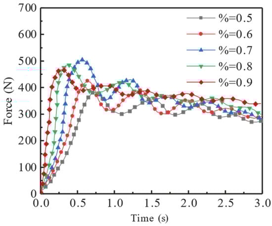 Next, it was determined that the maximum value of longitudinal impact force was related to the liquid filling ratio. For the TLR of 0.7, the maximum longitudinal impact force was 504.5 N. According to Equation (6), the longitudinal impact force is related to the liquid quality and the degree of liquid oscillation displacement []. When the liquid filling ratio was 0.7, the liquid wobble increased, that is, its oscillation degree increased, and the maximum longitudinal impact force value increased.