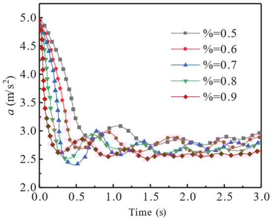 The changes in the effective braking deceleration at different IVs are given in Figure 11. After the braking starts, regardless of the IV, the effective braking deceleration decreases to the minimum value of 2.41 m⋅s−2 at around 0.5 s. Owing to the oscillation of the liquid tank and the liquid impact on the tank wall in the beginning stage of the tracked vehicle braking, the actual deceleration is less than 4 m⋅s−2.