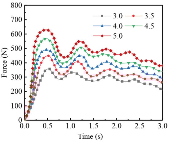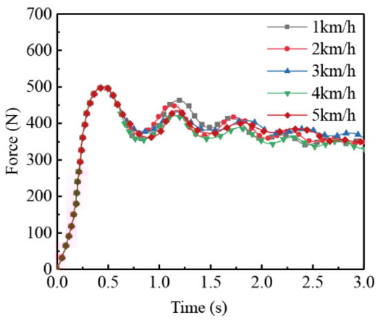 The IBD of the tracked vehicle was 4 m⋅s−2, the TLR was 0.7, and the IV was varied from 1 to 5 km⋅h−1. The simulation results for the longitudinal impact force obtained at different IV levels are shown in Figure 10.