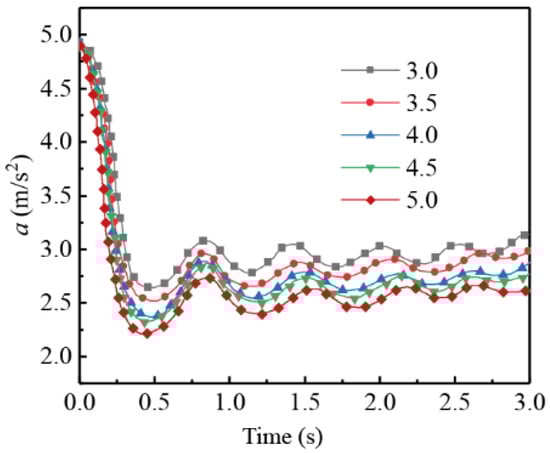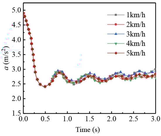 The IV of the tracked vehicles was kept constant at 5 km⋅h−1, the TLR was 0.7, and the deceleration speed was changed from 3 to 5 m⋅s−2. The simulation results obtained for the longitudinal impact force at different deceleration speeds are given in Figure 13.