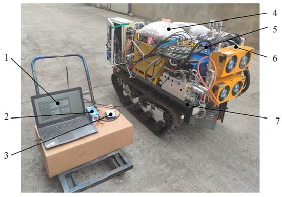 Figure 16 exhibits the dynamic stability experimental device of the tracked vehicle. It was set up to experiment and verify the longitudinal stability of the tracked vehicle under braking conditions. The experimental device comprised of the physical prototype of the tracked vehicle and the data detection system.