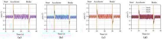 Experimental data obtained for effective braking deceleration during starting, accelerating, walking, and braking of a tracked vehicle: (a) IV 1 km⋅h−1; (b) IV 2 km⋅h−1; (c) IV 3 km⋅h−1; and (d) comparison of each IV condition.