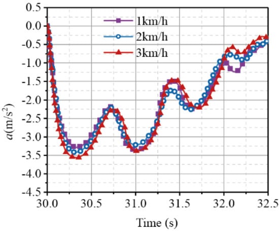 Experimental data for the effective braking deceleration were obtained corresponding to the start, acceleration, movement, and braking of the tracked vehicle at the IVs of 1, 2, and 3 km⋅h−1, respectively, and the corresponding data are shown in Figure 17.