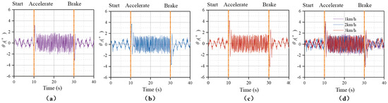 Experimental data obtained for longitudinal angular displacement of the tracked vehicle during starting, accelerating, walking, and braking: (a) IV 1 km⋅h−1; (b) IV 2 km⋅h−1; (c) IV 3 km⋅h−1; and (d) comparison of each IV condition.