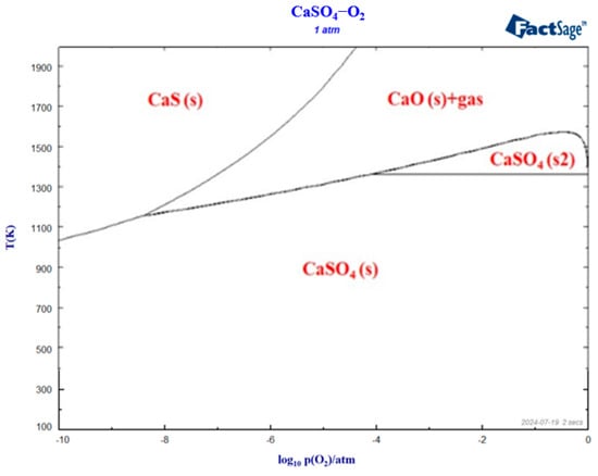 The phase diagram is a valuable tool for materials design, serving as a guidebook for metallurgists and a source of thermodynamic data. It is widely used in various fields, including metallurgy, materials, and chemicals [84,85,86]. While experimental methods ensure accurate phase diagram determination, they require a significant workload, making it difficult to meet practical requirements [87]. In contrast, Factsage, which combines thermodynamic theory and computer simulation, has gained acceptance among researchers for its ability to draw phase diagrams. Figure 2 illustrates the decomposition phase diagram of pure calcium sulfate, which depicts the decomposition reaction of calcium sulfate at varying oxygen partial pressures and temperatures. The use of software to draw phase diagrams saves time and reduces experimental workload, making it both feasible and necessary.