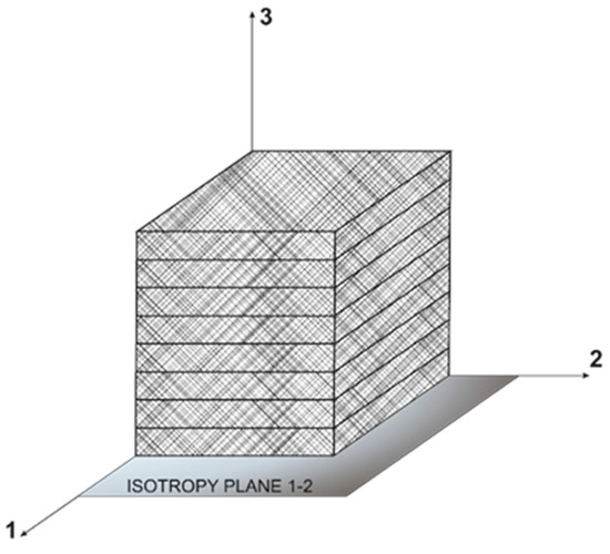 In transversally isotropic model, assuming the isotropy plane in directions 1–2, the modulus of elasticity is defined as follows: E1 = E2, E3, ν = ν12 = ν13 = ν23, G13. Additionally, the modulus of shear elasticity in the isotropy plane G12 can be distinguished, calculated from the formula: