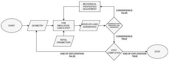 In the presented method, the Nelder–Mead algorithm is used as a method to optimize the search for the minimum of a function [68,69]. This approach does not require the computation of gradients, making it suitable for functions that are noisy or have discontinuities. Operational boundary parameters and laboratory parameters of geomechanical rock layers are required as input data, as initial parameters of the rock mass. The objective function was defined as the RMSE error value, which allows comparison of the simulated subsidence with the results of geodetic observations.