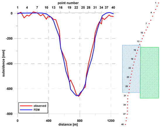 The second series of land surface subsidence measurements were carried out at the end of November 2021. As of this day, the face advance of longwall panel 501 was determined at a distance of 500 m from the beginning of the longwall. The maximum measured subsidence was 36 mm and it was located in point no. 23. Having this information, the parameters of the rock layers were calibrated using ABAQUS 2022 hf4 software and author’s Python 3.9 script in order to adjust the simulated subsidence to the real values. The estimated values of mechanical parameters are listed in Table 5 and the plot of fit is shown in Figure 6.