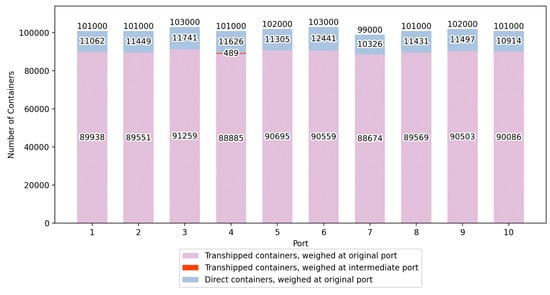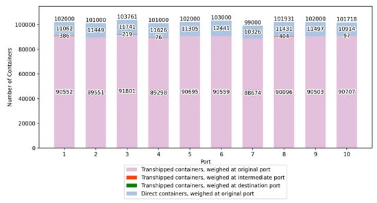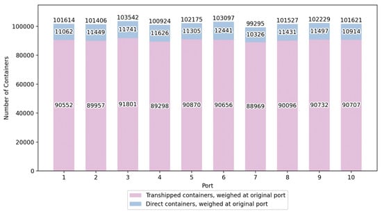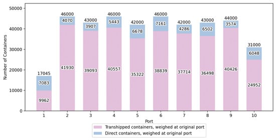 For the containers that are to be transferred from the origin port to the destination via the intermediate port (), let represent the number of containers weighed at the origin port , represent the number of containers weighed at the intermediate port , and represent the number of containers weighed at the destination port . For the containers that are to be transferred directly from the origin port to the destination port , let represent the number of containers weighed at the origin port , and represent the number of containers weighed at the destination port .