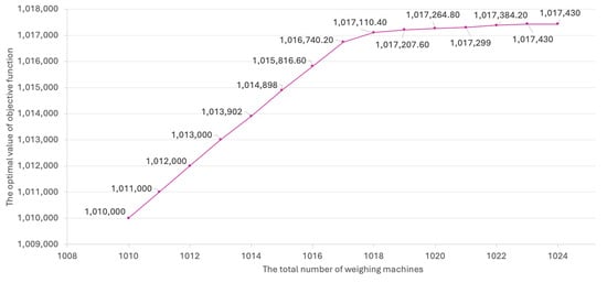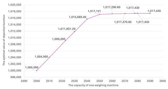 Third, ports can increase the capacity of each weighing machine, which allows for an increased number of containers to be weighed. When the capacity of the machine is increased, the objective function value increases in a fashion similar to that when the number of machines is increased. Specifically, the objective function value transitions from steady to decelerating before stabilizing. Port managers can increase weighing capacity through upgrading weighing technology, enhancing personnel training, and implementing intelligent management. By implementing these measures, port managers can effectively increase the capacity and accuracy of container weighing machines, thereby improving port operations and enhancing overall competitiveness.