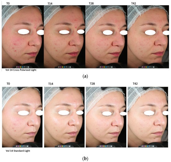 VISIA pictures: (a) polarized light; (b) standard light, evaluated at baseline (T0) and after 14 (T14), 28 (T28), and 42 (T42) days.