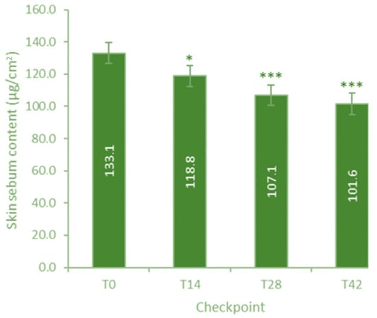 Evolution of sebum content (baseline, T0; days 14, 28, and 42.) Data are expressed as mean ± SE. The intragroup statistical analysis vs. T0 is reported as follows: * p < 0.01; *** p < 0.001.