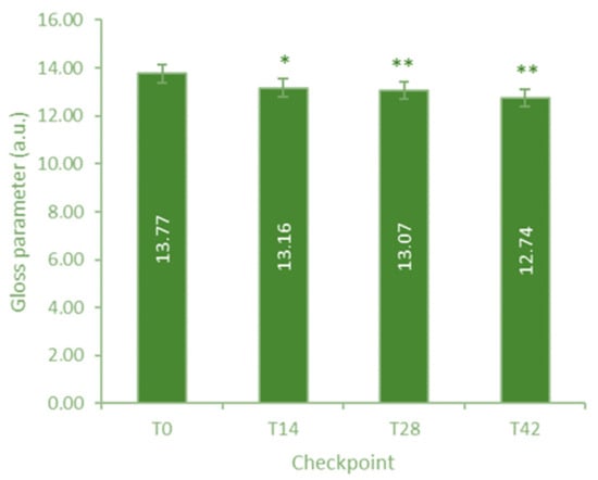 Evolution of gloss parameter (matt effect) (baseline, T0; days 14, 28, and 42). Data are expressed as mean ± SE. The intragroup statistical analysis vs. T0 is reported as follows: * p < 0.05; ** p < 0.01.