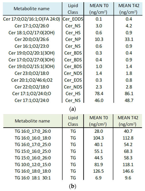 Lipidomic analysis of ceramides classes (a) and triglycerides classes (b) with sebum contents at baseline (T0) and day 42 (T42). Ceramides and triglycerides show a statistical increase at T42 in comparison with baseline (p < 0.023).