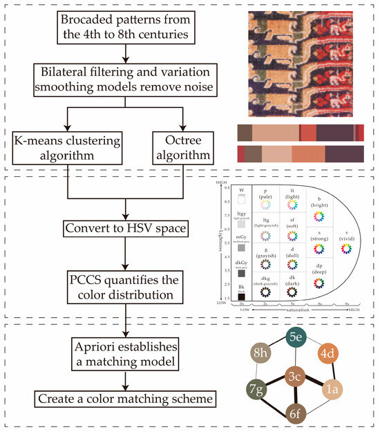 Therefore, an image-based matching network modeling method was proposed to analyze the characteristic colors of 4th–8th century brocade. Based on the color images, SFFCM was used for image segmentation to improve the complexity and reduce the running time. The K-means algorithm was then used for color classification by calculating the distance between each sample and the cluster center. Compared with the fuzzy clustering method, the K-means algorithm has the advantages of a fast processing speed and easy implementation. The characteristic colors of the brocade images were converted into HSV space. By combining the PCCS system for analyzing the hue of the representative color and the color distribution, the Apriori algorithm was applied to establish the matching network model between secondary colors. The color matching scheme can be established, as shown in Figure 1. As for the images of brocade patterns from the 4th to 8th centuries, bilateral filtering and variation smoothing models were used to remove noise from the images. K-means clustering and the octree algorithm were then used to compare the results, and the color value was converted into HSV space to analyze the distribution with PCCS system. Finally, a color matching model was proposed using the Apriori algorithm and can be applied to a new product.