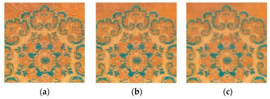 One style of the brocade pattern was taken as an example (see Figure 4a), and the experimental results were compared with different settings of the σS and σr values. The results showed that when the σS was set to 5 and σr was 0.35, the extracted edges of the pattern demonstrated the best appearance. Figure 4b illustrates the effect after dual edge filter blurring. Similarly, several experiments were conducted to compare the outcomes, and the appropriate parameters were finally set to obtain better smoothing results, as seen in Figure 4c.