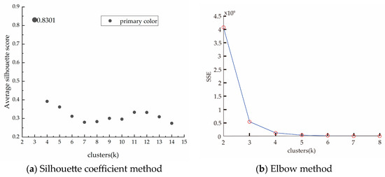 All the colors extracted from the 165 images were analyzed by these two methods, and the determination of the cluster number for the primary color was taken as an example. Figure 5a shows the results of the silhouette coefficient method, and the S(i) value is the largest and generally approaches 1 when the K-value is three. Figure 5b indicates that the cluster effect is the best when the K-value is three using the elbow method. Therefore, after combining the two methods, the optimal cluster number is selected as three for the primary colors. Similarly, the cluster number of the secondary colors should be set as nine.