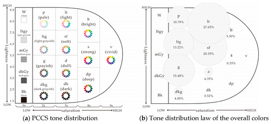 In visual perception, the color tone is determined by the differences in color brightness and saturation. The Practical Color Coordinate System (PCCS) was developed by the Japan Color Research Institute in 1964 and is based on psychological elements. Since the main feature of the PCCS is its hue–tone system, the PCCS has the advantage of treating color as an image using its tone. The Practical Color Coordinate System (PCCS) is commonly used by designers to achieve various color matching relationships, and the principle is different tone series [25]. The 12-tone distribution and the corresponding color representation are shown in Figure 7a.