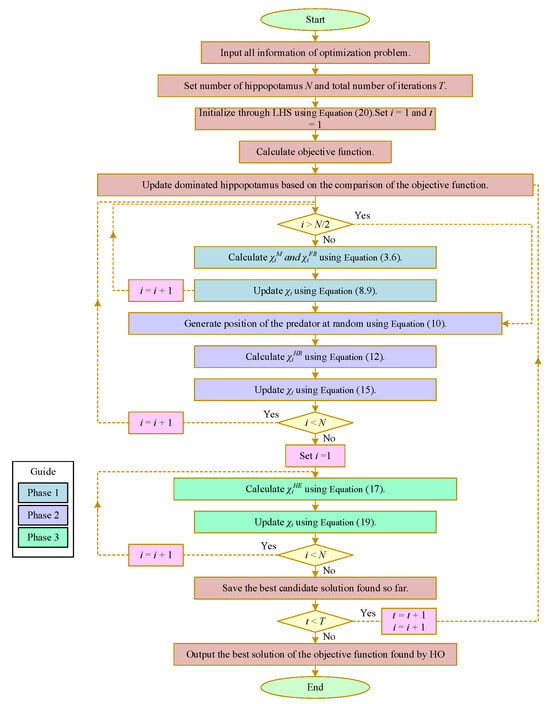 HO is a novel metaheuristic algorithm (intelligent optimization algorithm) inspired by the inherent behavior of hippopotamuses. The flowchart is shown in Figure 1.