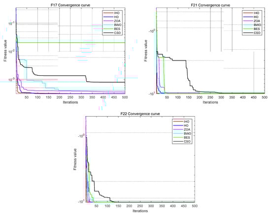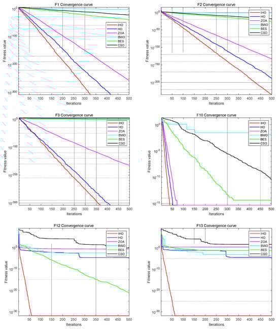 F1, F2, and F3 are unimodal functions used to test the convergence rate of the algorithm and local search ability. Table 2 shows that IHO significantly outperformed the other five optimization algorithms on the unimodal function. For functions F1, F2, and F3, the optimal value and mean value of IHO are also optimal. This shows the excellent local search ability of IHO.