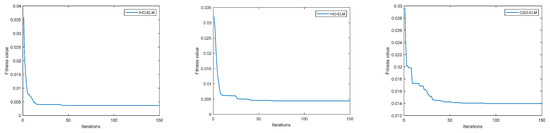The computational efficiency of optimization algorithms can usually be evaluated for their performance. So, this article first analyzes the efficiency of algorithms. When optimizing the connection weights and thresholds of the ELM model, set the value of the optimization algorithm population to 20 and set the maximum number of iterations to 150. The fitness values of the IHO algorithm proposed in this paper were compared with those of the HO algorithm and CSO algorithm; the results are shown in Figure 7.