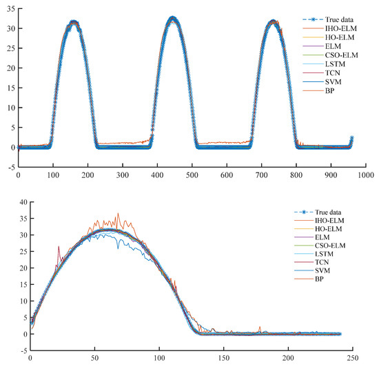 Secondly, to assess the performance of the model presented in this paper, we compared it with the three models from the two perspectives of optimization algorithm and single model. In terms of a single model, an ELM single model is selected for comparison. In terms of optimization algorithms, a comparison was made between the CSO-optimized ELM and the unimproved HO algorithm-optimized ELM. The comparison results are presented in Table 3 and Table 4.