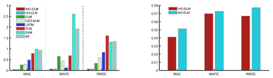 - The optimized model has better accuracy than the unoptimized model and the traditional CSO-optimized model. The MAPE, RMSE, MAE, and MSE indicators of the IHO-ELM were reduced by 17.62%, 21.61%, 22.78%, and 38.5%, respectively, compared to the HO-ELM from Table 4, significantly better than the unimproved HO optimization model.