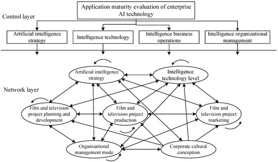 The ANP is a multi-attribute decision model developed by the famous American operations research scientist Saaty. Its unique feature is that the ANP allows for the consideration of the interdependence and feedback between system elements [46]. With the development of the analytic hierarchy process (AHP), the ANP contains interdependencies within and between hierarchies, which objectively reflect the relative weights of various influencing factors. In complex environments, the ANP is more practical than the AHP is. Under the ANP method, the system elements are composed of two types of elements: control layer elements, including the overall objective and decision criteria, and network layer elements, which may be interrelated and influence each other, forming a network structure composed of individual element groups and influencing relationships. Thus, in the ANP, not only does the importance of the decision criteria determine the importance of the elements, but the importance of the elements also determines the importance of the individual criteria. Considering that the evaluation of the application maturity of enterprise AI technology is a complex system problem, it is more scientific and reasonable to evaluate the evaluation index model of the application maturity of enterprise AI technology using the ANP method in this study, which can consider the complex relationships among various indexes of the application maturity of enterprise AI technology.