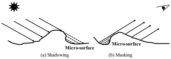 (a) Due to the micro-geometry, some micro-planes are occluded and do not receive light (shadowing). (b) Light reflected from micro-planes that cannot be seen from the observation direction is also not visible (masking).