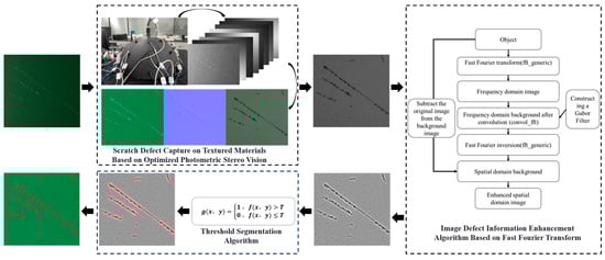 To address the challenges posed by textured materials, we developed an enhanced scratch defect detection method for textured materials based on optimized photometric stereo vision and FFT-Gabor filtering. Initially, we developed an Enhanced Scratch Detection method for textured materials. This method is characterized as a composite-enhanced defect detection method that combines optimized photometric stereo vision hardware with an FFT-based image enhancement algorithm. The main contributions of this paper can be summarized as follows: