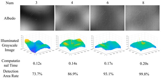 Given that the photometric stereo algorithm adopted herein necessitates binarized grayscale processing for acquired images, we carried out preliminary investigations, leading us to conclude that the impact of light color temperature on image quality can be largely disregarded. According to the principles of photometric stereo algorithms, at least three images from different lighting angles need to be captured. Our analysis, as illustrated in Figure 4, elucidates the influence of varying numbers of light sources on image quality. We have presented the Albedo images synthesized using the photometric stereo algorithm under different numbers of light sources, along with the Computational Time and the Detection Area Rate of scratches that can be observed. To better illustrate the impact of varying numbers of light sources on image quality, we introduced 3D Illuminated Grayscale Images to evaluate the uniformity of surface illumination. A gradual shift towards bluer colors in the images indicates lower heights, aiding in distinguishing scratches from background textures. A reduced number of light sources markedly expedites computational processes; however, this comes at the cost of uneven illumination, which may obscure certain scratch areas, thereby compromising the quality of the synthesized images. Conversely, augmenting the number of light sources offers enhanced cues for accurate reconstruction, albeit at the expense of decreased computational efficiency. In pursuit of an equilibrium between image quality and computational time, while concurrently striving to mitigate the uneven illumination issues inherent to photometric stereo lighting, this paper has judiciously selected eight light sources positioned at angles of 0°, 45°, 90°, 135°, 180°, −135°, −90°, and −45°. These sources are sequentially activated in strict accordance with their angular arrangement via the computer interface, thereby ensuring consistent and uniform lighting across every image captured.