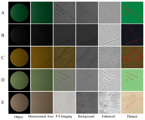 By observing the detection effect of all the samples and analyzing the experimental data, we find that the ratio of the number of detected scratches to the actual number of scratches is consistently at 100%; the ratio of correctly identified scratches is stable at 98.43% ± 1.0%; the accuracy of the detected scratch lengths is at 97.84% ± 2.0%; and the coverage rate of the detected scratches over the real area is stable at 99.51% ± 5.0%. We can conclude that the method proposed in this paper, “Enhanced Scratch Detection for Textured Materials Based on Optimized Photometric Stereo Vision and FFT-Gabor Filtering”, is applicable to the detection of scratch defects on most textured materials encountered in everyday life.