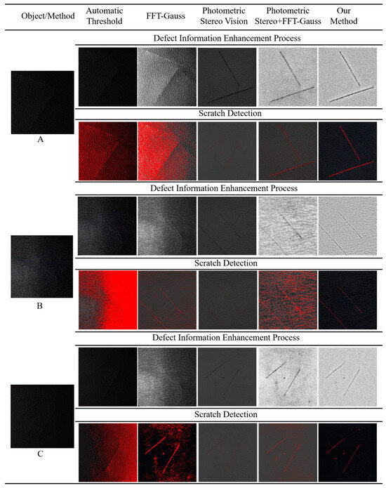 Comparison of Two-Dimensional Detection Methods: We compared our method with automatic threshold segmentation [12,46] and fast Fourier transform based on Gaussian filtering (FFT-Gauss) [47]. Automatic threshold segmentation can achieve the fastest binary segmentation of an image; however, due to the influence of the material’s texture, it fails to distinguish between scratches and the texture on the surface of the material. The FFT enhances the high-frequency information of the image, but the FFT alone tends to enhance both scratches and texture simultaneously and is affected by the lighting angle, making it difficult to fully observe the scratches. The limitations of these methods in detecting defects on textured materials are evident, as they often fail to distinguish between scratches and surface textures. For clarity, the detection results are shown in the first three columns of Figure 10.