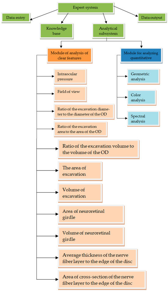 The proposed approach to the recognition of images of fundi is based on the use of the knowledge of specialists in the field of ophthalmology and consists of creating an expert system for the diagnosis of glaucoma. The basis of the system is a reference sample of digital images, the description of which is stored in the knowledge base. An important component of the system is the analytical subsystem, which includes many rules by which decisions are made (Figure 1) [19,20,21,22].