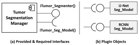 Figure 4a shows two different interfaces of this component: a provided interface, iTumor_Segmenter(), and a required interface, iTumor_Seg_Model(), which is implemented in various ways using different CNN segmentation algorithms. Figure 4b shows two plugin objects implemented with different CNN algorithms that can equally bind to the required interface. This will enable the component Tumor Segmentation Manager to work with any valid CNN segmentation model.
