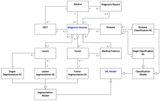 Note that association relationships are defined between classes capturing diagnosis results and the ML models used for diagnosis. For example, the Tumor class is associated with the Tumor Segmentation Model, making it possible to trace which ML model is utilized for segmenting each specific tumor.