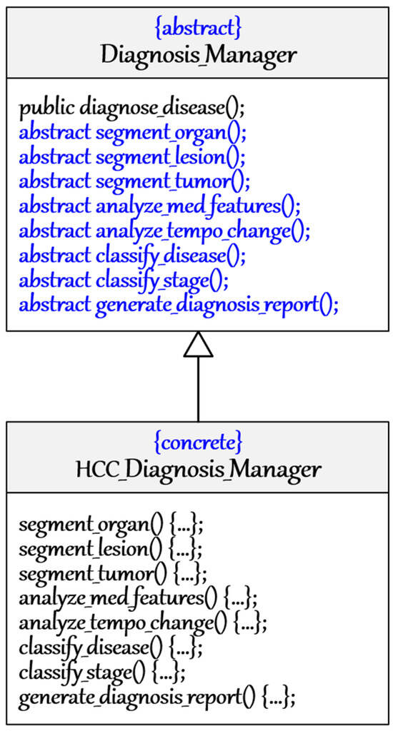 The figure illustrates three subclasses that implement the abstract methods defined in the superclass. Each subclass adapts these methods to its specific requirements. For instance, the subclass Liver_Cancer_Diagnosis_Manager implements the segment_organ() method to segment the liver from a given CECT scan. Additionally, it implements the classify_disease() method to classify the type of liver cancer, such as hepatocellular carcinoma (HCC), by applying a standard called Liver Imaging Reporting and Data System (LI-RADS). This classification is based on the analysis of identified tumors, changes over contrast phases, and medical imaging data. The classify_stage() method of this subclass will determine a HCC stage using the categories of LR-NC (Not Categorizable), LR-1, LR-2, LR-3, LR-4, LR-5, LR-5V, LR-M, and LR-TR.