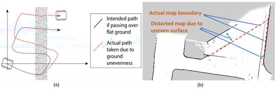 For autonomous mobile robots, uneven terrains could cause localization and path planning issues while they are performing their operation [34]. These robots perceive their surroundings using sensors such as Inertial Measurement Units (IMU), LIDARs, cameras, and wheel encoders. Uneven surfaces can introduce errors in the data collected by these sensors, leading to the robot’s failure in sensing its location and orientation and its eventual execution of tasks [35] (examples are given in Figure 1). Prominent errors/issues posed to sensing related to localization by unevenness are as follows: