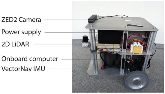 The proposed framework for the autonomous evaluation of the RIL-SU of buildings was implemented on the Meerkat robot platform shown in Figure 2. Meerkat is an autonomous mobile robot with a differential drive mechanism for navigational tasks. The platform’s sensors and embedded systems ensure reliable navigation, accurate positioning, and effective environmental mapping. DC motors drive the robot wheels (Oriental Motor driver, Elk Grove Village, IL, USA), and the robot’s odometry is calculated from the data received from the encoders. The LIDAR sensor (Sick TiM581-2050101, Waldkirch, Germany)) mounted on the robot is utilized for creating maps of the environment, identifying obstacles, devising safe routes, and precise navigation. An IMU (VectorNav VN-100, Dallas, TX, USA) positioned at the base of the Meerkat robot ensures optimal results in calculating the robot’s orientation and surface unevenness (U). A stereo vision camera (ZED 2, Stereolabs, San Francisco, CA, USA) is also installed on the robot and can be used for performing vision-based tasks such as object tracking and detection. A high-performance CPU is onboard to ensure seamless communication between integrated sensors and the computational processing of data in real time to perform autonomous tasks with a higher efficiency.